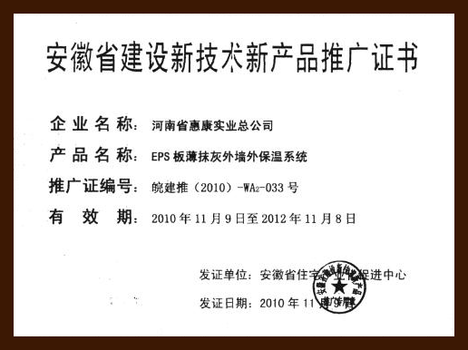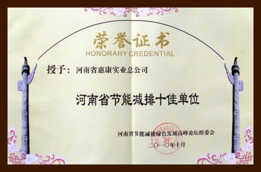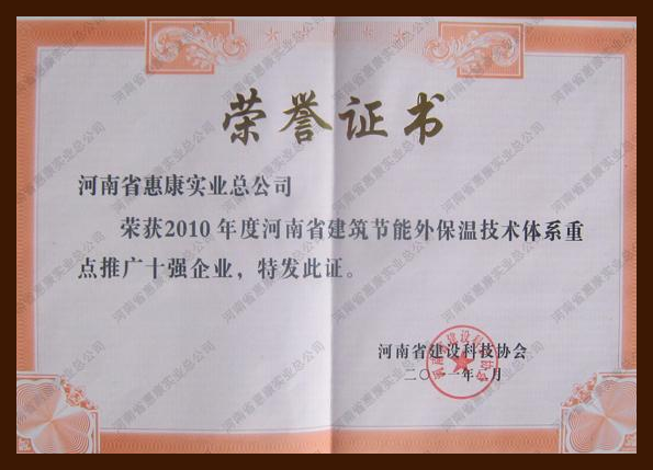 河南省惠康實業(yè)總公司榮獲2010年度河南省建筑節(jié)能外保溫技術(shù)體系重點推廣十強企業(yè)。